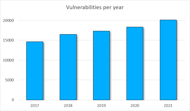 To estimate the number of vulnerabilities found year by year, it is enough to look at the CVE (Common Vulnerabilities and Exposures) statistics. The graph below shows the number of vulnerabilities found from 2017 to 2021. The data is provided by National Vulnerability Database (NVD).