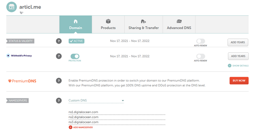 Now we are ready to move on to connecting the domain with your Droplet in the DigitalOcean control panel.