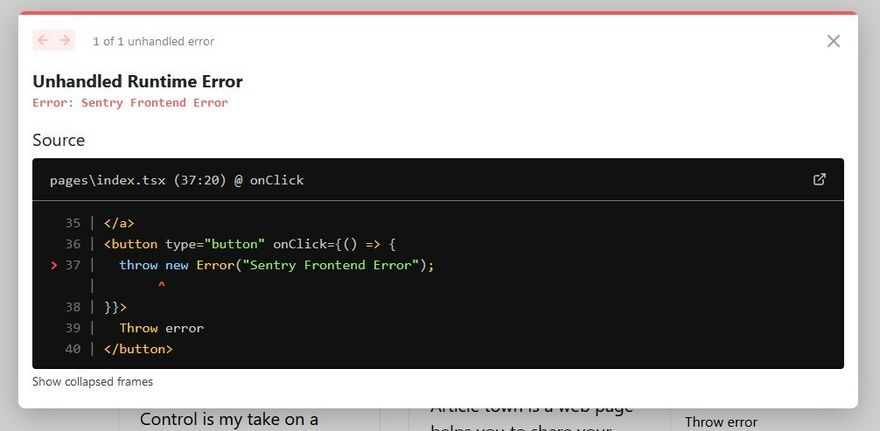 To check every thing works fine, we will trigger a button click event in a frontend component that throws an error.