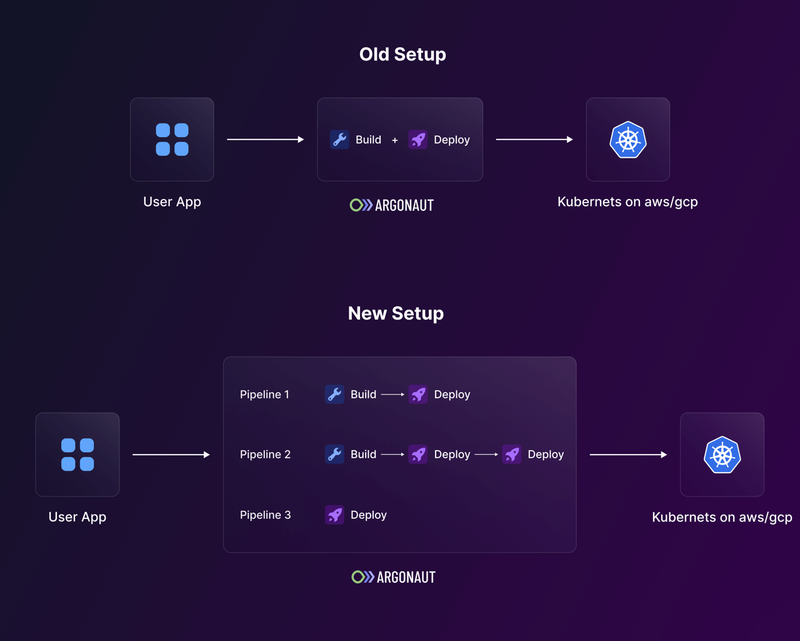 These workflows were also triggered from Argonaut each time using Helm. This meant there was more involvement of Argonaut’s backend to complete the tasks and ensure that all your deployments are being carried on as expected. Our backend had to be stateful for the most part and directly involved in keeping up with user deployments.