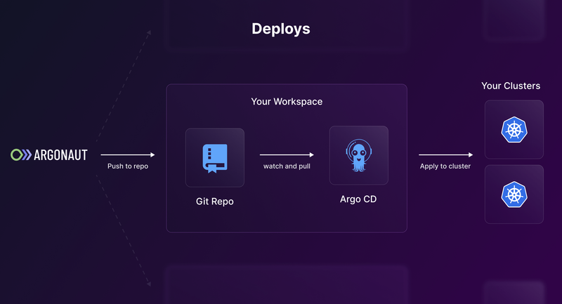 Secondly, we now have an internal Argonaut GitHub with a unique repository for each workspace our user creates. This repo for your org will house all the config files and Helm values.yaml files. The ArgoCD instances for your org will watch for changes to this Git repo and automatically apply the changes when they notice them. By doing so, we can implement GitOps-powered deployment flows for your applications.