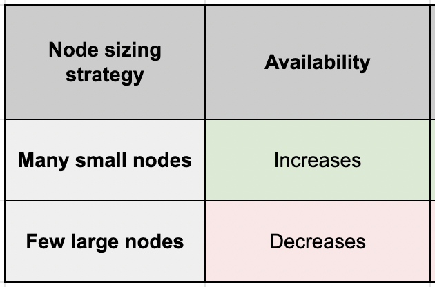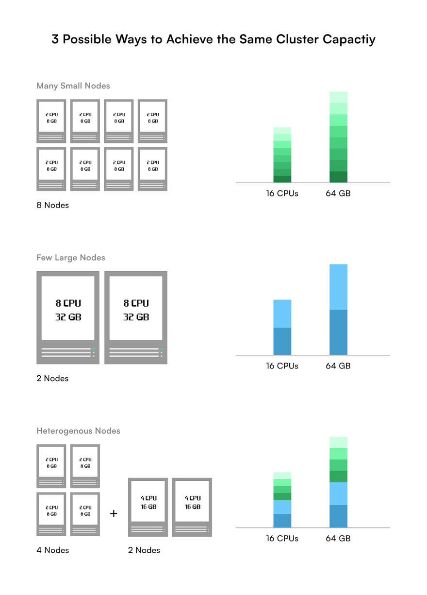 The impact of using heterogeneous nodes will be a combination of what the table above outlines for many small nodes and a few larger nodes. In general, you’ll find it more complex to manage loads on heterogeneous node sizes compared to the other two sizing approaches.