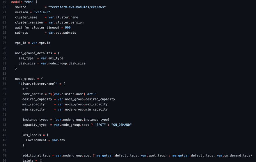 For example, on line 19, you can see how the worker nodes for Kubernetes are configured. When you input the number of instances you want to create via the Argonaut Environment setup, the code in the screenshot below (specifically starting on line 34) is how EKS knows via the variables how many worker nodes you want to create.