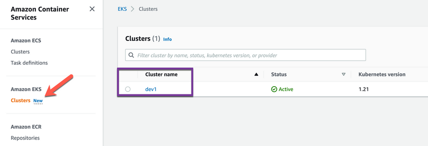 Within the EKS page, you’ll see the EKS cluster. Notice how it’s named the same as the VPC. That’s because it gets the same name as when you were setting up the Argonaut environment, just like the VPC.