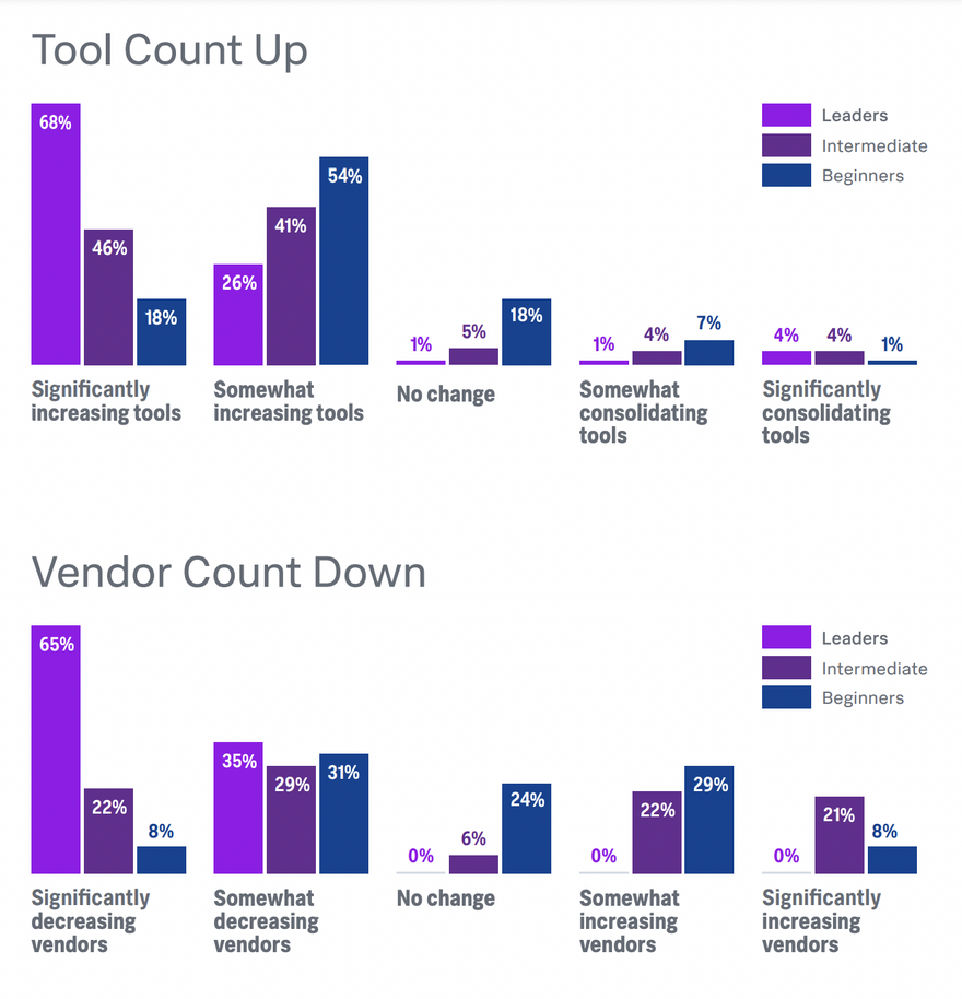 - If you’re not quite ready for enterprise volume discounts, look to use multiple tools from different vendors. More than half of the customers surveyed use ten or more tools.