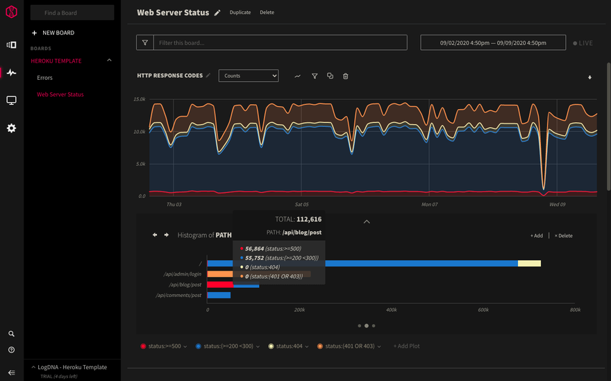 Better Stack comprises four tools: log management, uptime monitoring, incident management, and public status pages. Their log solutions are based on ClickHouse and in a SQL-compatible structured log format. It comes with hosted Grafana charts and dashboards, easy team collaboration, and filters.