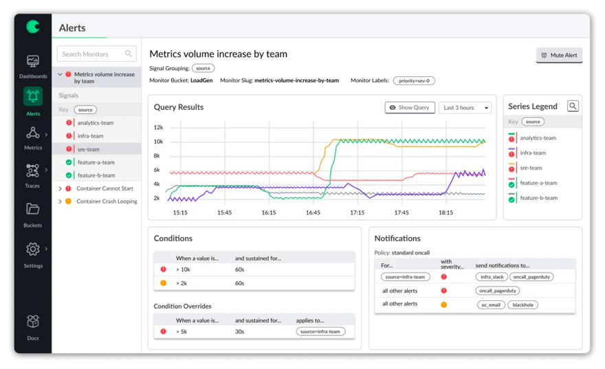 It can bring infra metrics and application metrics in one place. They are built specifically for Cloud, Kubernetes, and serverless systems. All their analysis is machine-learning powered and makes it easy to monitor what matters to the user with SLOs. Running queries on your data is quick and easy and doesn't require learning additional query language.