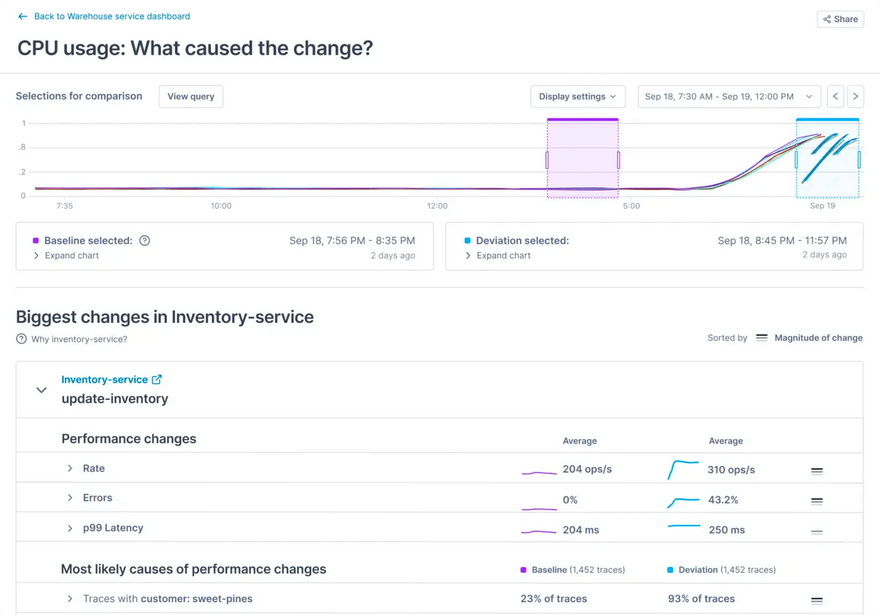 Lightstep’s incident response brings team collaboration and automatically pinpoints potential causes of the issue. It also groups alerts using machine learning and helps you stay in context throughout the incident resolution process.