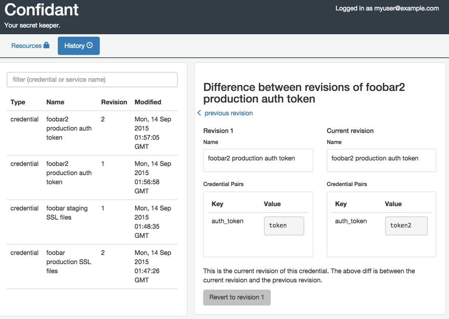 Secrets are encrypted and stored at rest in an append-only way in DynamoDB, generating a unique KMS data key for every revision of every secret, using Fernet symmetric authenticated cryptography. Confidant has two views: the resources view and the history view.