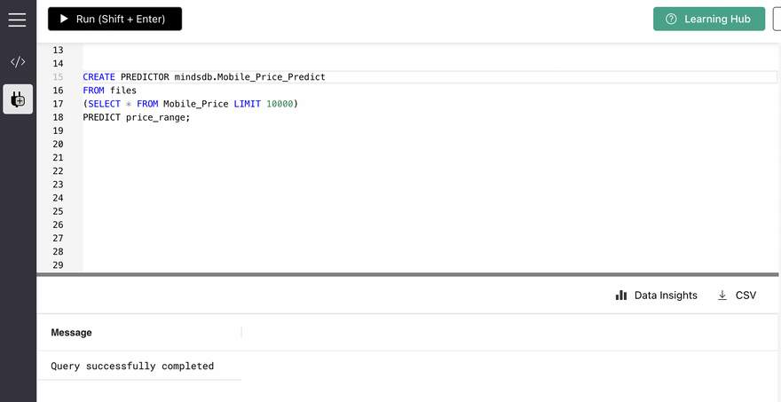 Step 1: We will now use the CREATE PREDICTOR syntax to create the Predictor. The syntax will be like this.