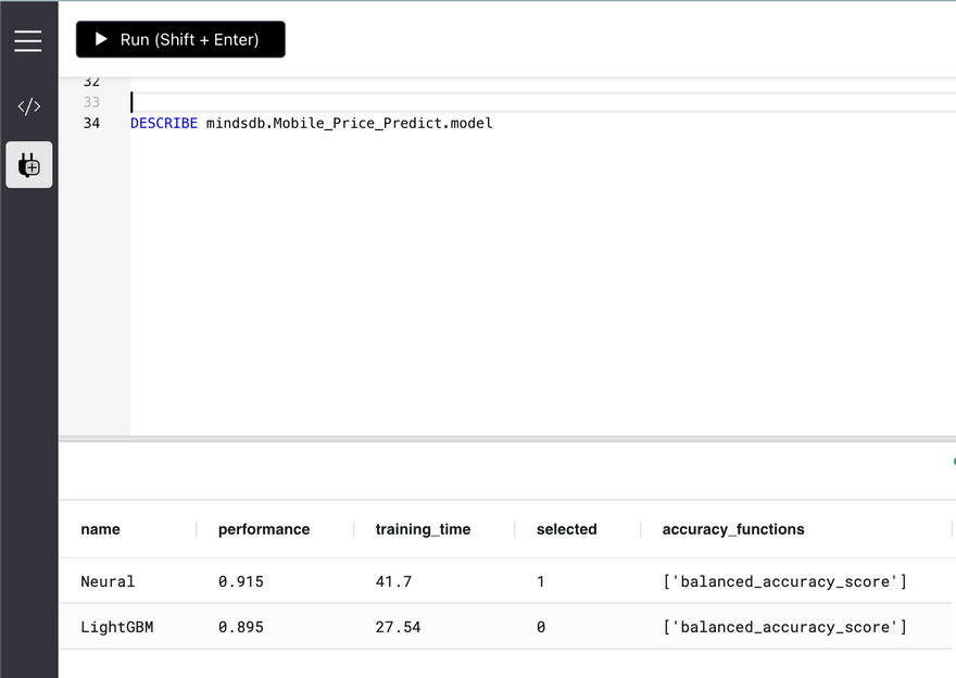 MindsDB uses multiple models internally to train the data and then select the most optimized one for the model to do the predictions. This statement simply lists out all the candidate models used to train the data along with other details. The model with 1 in its selected column is the one that is the most optimized and accurate.
