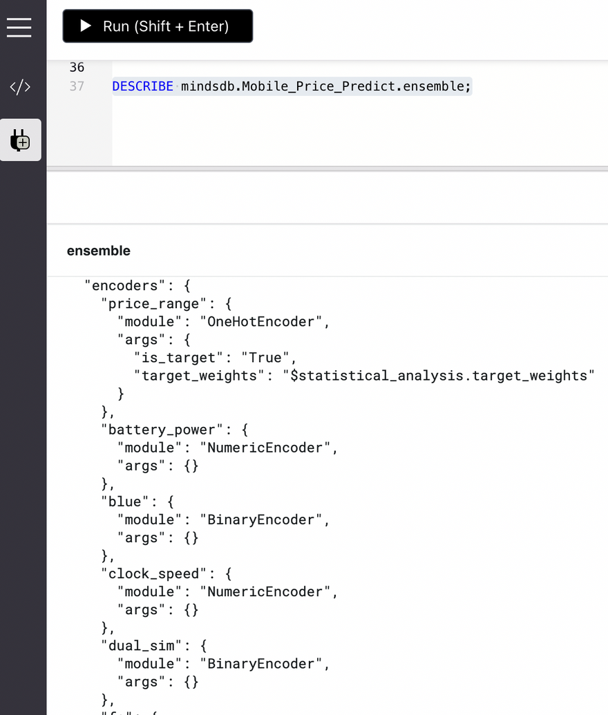 MindsDB provides a DESCRIBE statement that we can use to gain some insights into the Predictor Model. We can find more details about the model in the following three ways.