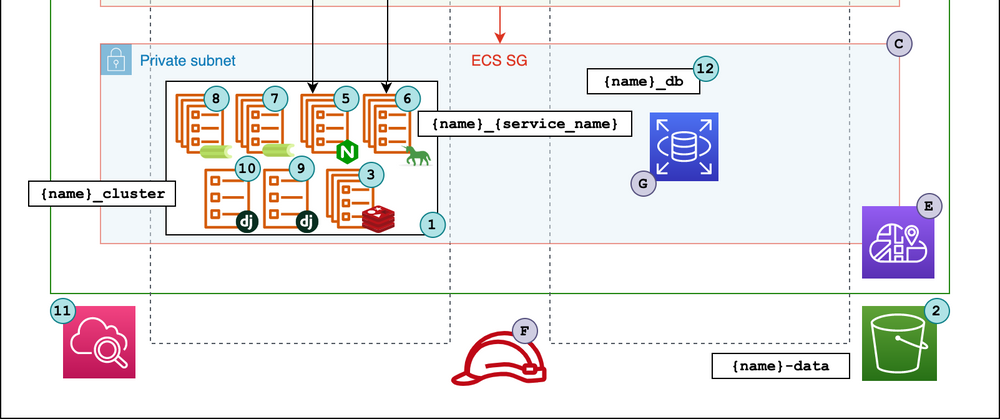 We now have our backend services (gunicorn, celery and celerybeat) running on Fargate spot instances, and these services can communicate with the redis service in our ad hoc environment's ECS cluster using service discovery that we configured with Cloud Map. We still need to think about a few things: