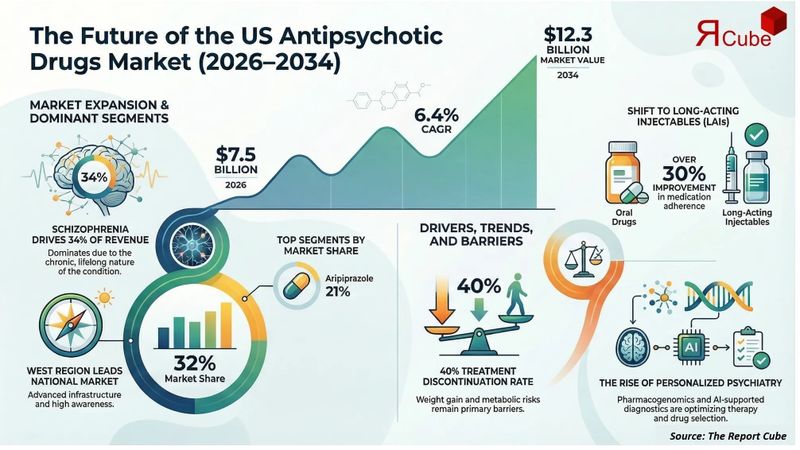 The Report Cube, a leading market research company, has officially released its latest study titled "United States (US) Antipsychotic Drugs Market Report and Forecast 2026-2034" The report projects the size of United States (US) Antipsychotic Drugs market to be valued at USD 12.3 Billion by the end of the forecast period, expanding at a compound annual growth rate (CAGR) of 6.4%.