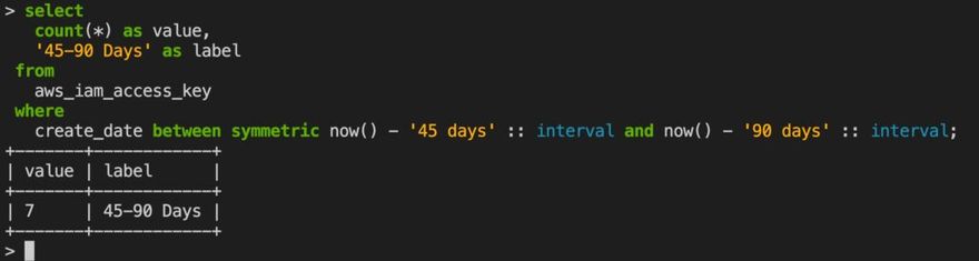 If you review the table definitions published on the AWS plugin page at Steampipe Hub, you will see lots of more advanced examples of what you can do with Steampipe. For example, let's say you want to get a count of IAM access keys that are between 45 and 90 days old: