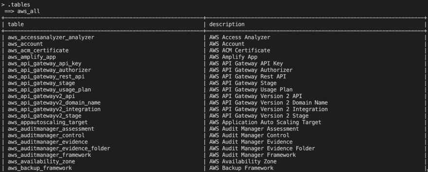 You can use the .inspect command to view details on connections and tables. Inspect is particularly powerful as you can use it to drill into a specific table to see what fields are available. For example here's a screenshot showing the .inspect aws_vpc command result: