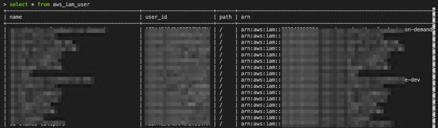 Once you've seen the connections and tables, you can get an idea of what types of queries you can run. As the help file suggests, you can start by getting a list of all the IAM users in all your configured accounts with the command select * from aws_iam_user which returns a table like this: