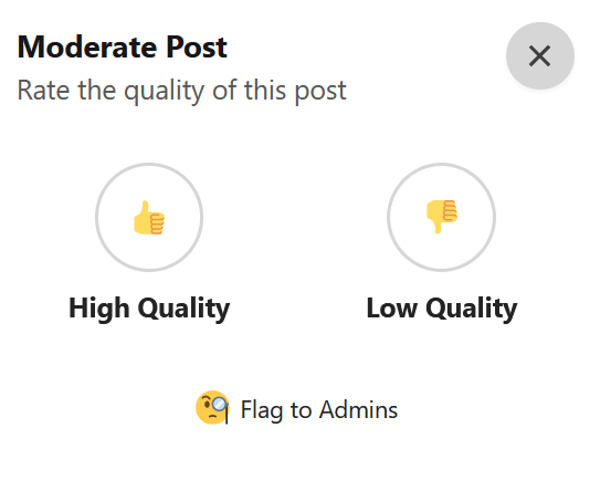 Trusted users are able to make use of the thumbsup, thumbsdown, and “Flag to Admins” buttons. Here's how each reaction works: