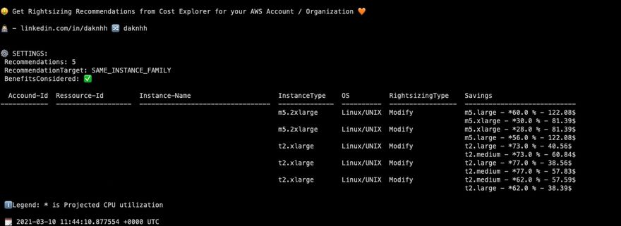 Get the Rightsizing Recommendations from Cost Explorer for your AWS Account / Organization.