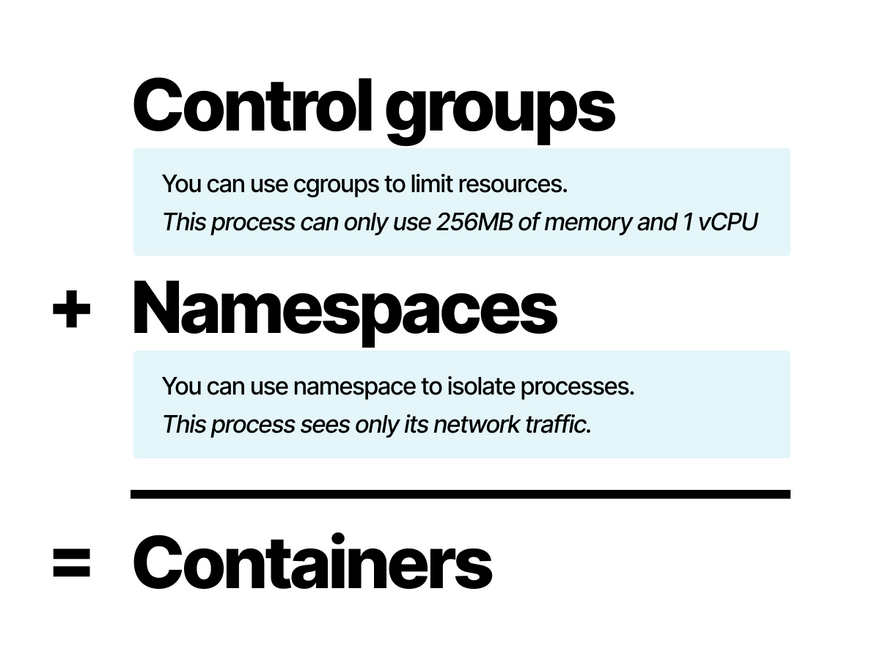 Containers are isolated using two Linux primitives: control groups and namespaces.