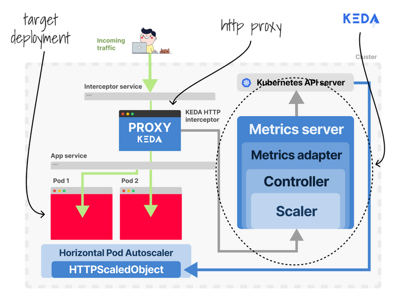 KEDA injects a sidecar proxy in your pod so that all the HTTP traffic is routed first.
