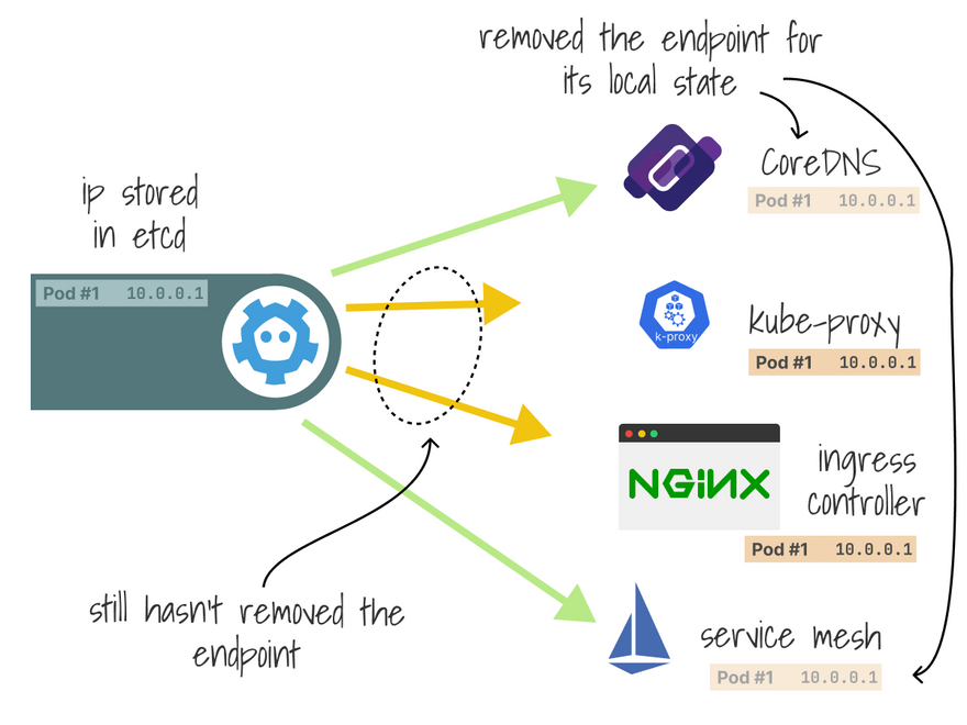 All those components will (eventually) remove the previous endpoint so that no traffic can ever reach it again.