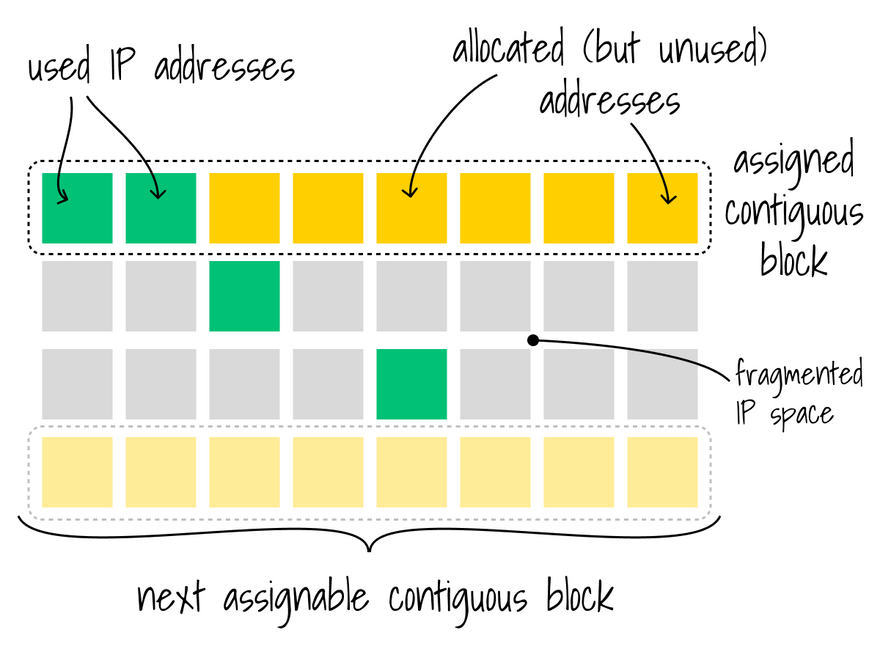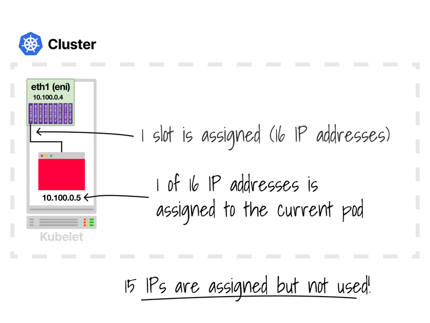 Assigning slots it's great until you realize that the CNI gives 16 IP addresses at once instead of only 1, which has the following implications: