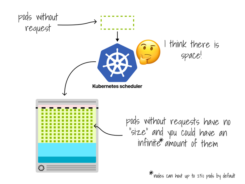 The Kubernetes scheduler doesn't know how much memory or CPU the process needs, so it could end up scheduling an impractical amount of pods in the existing nodes.