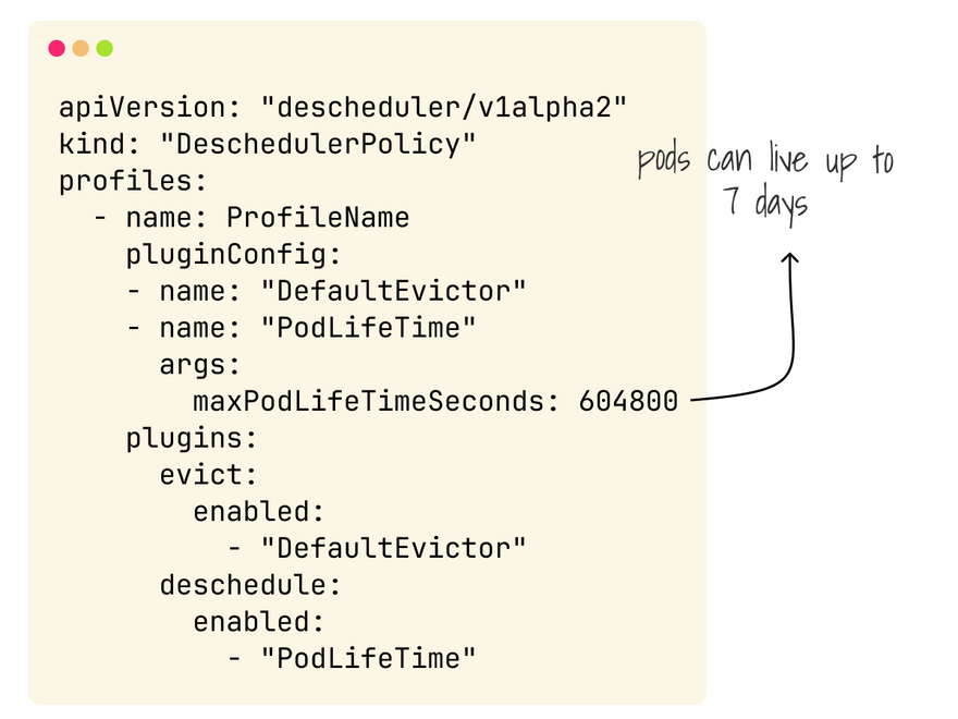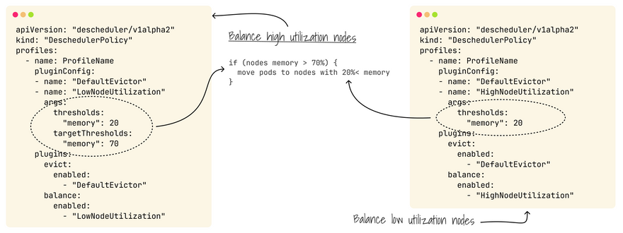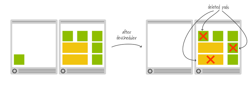 The Descheduler scans your cluster at regular intervals, and if it finds a node that is more utilized than others, it deletes a pod in that node.