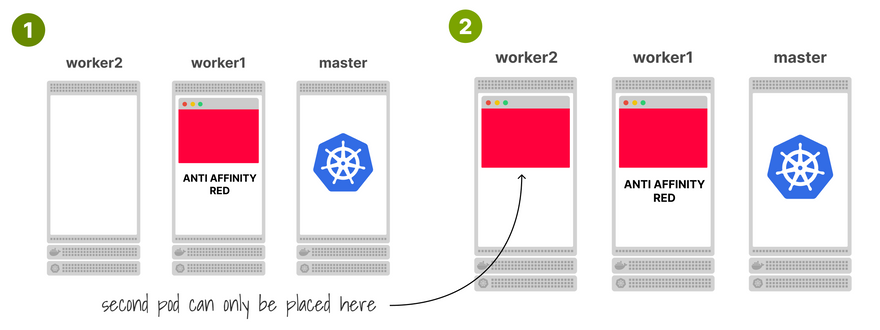With pod anti-affinity, your Pods repel other pods with the same label, forcing them to be on different nodes.