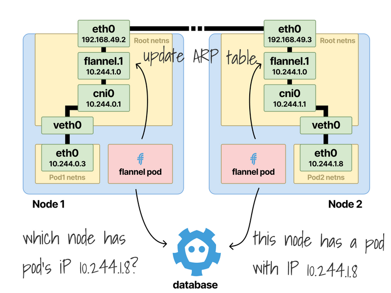 On each node, the Flannel daemon syncs the IP addresses allocations in a distributed database.