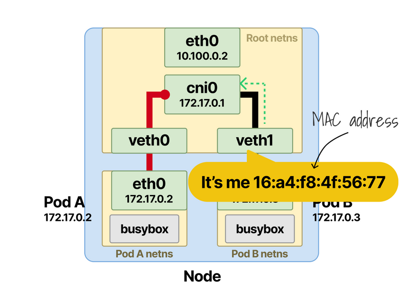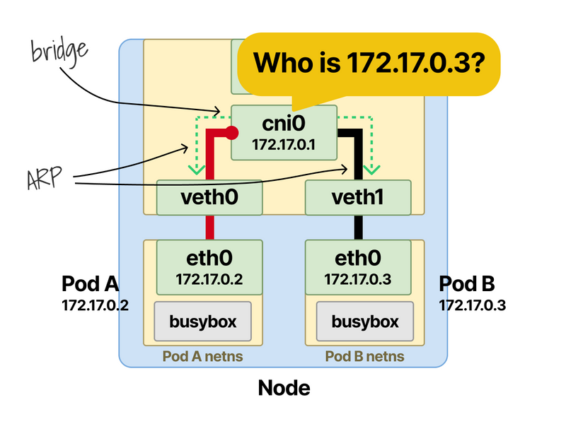 A reply is received with the interface's MAC address that connects Pod-B, which is stored in the bridge ARP cache (lookup table).