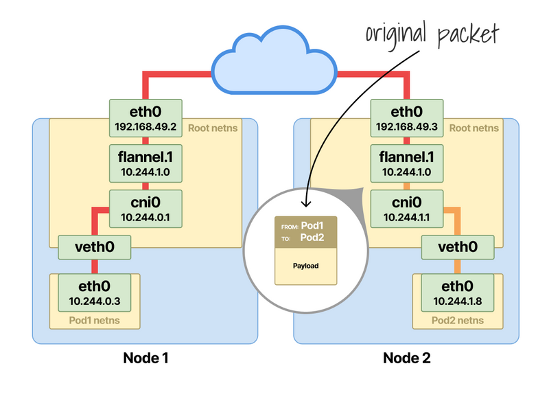 Once on the other side, the flannel.1 interface unwraps the packet and lets the original pod-to-pod packet reach its destination.