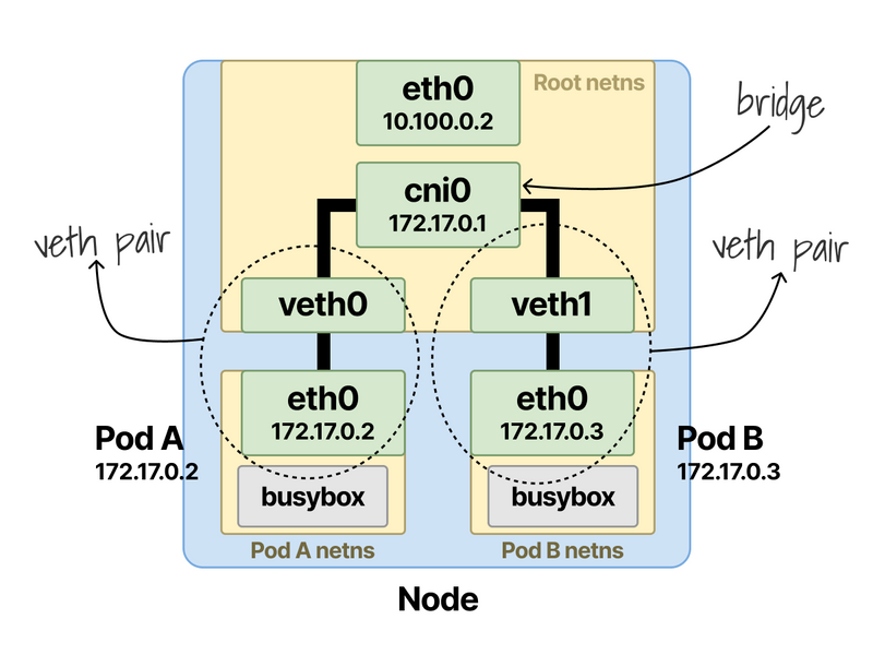 This is achieved using a virtual eth pair connecting the 2 namespaces: pod and root.