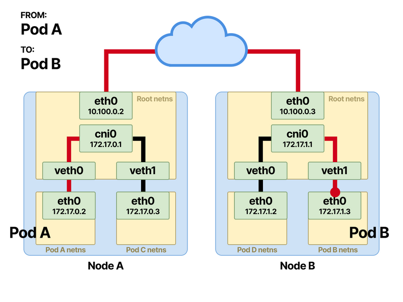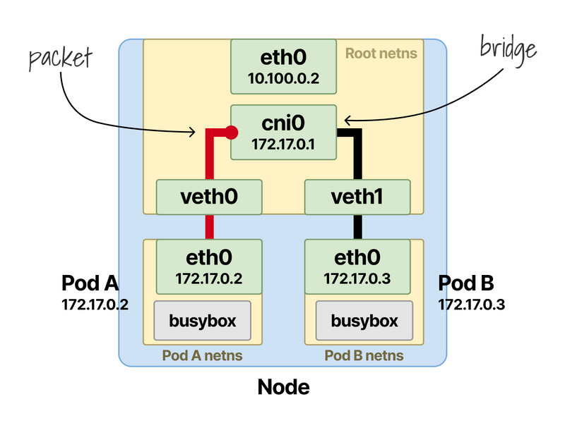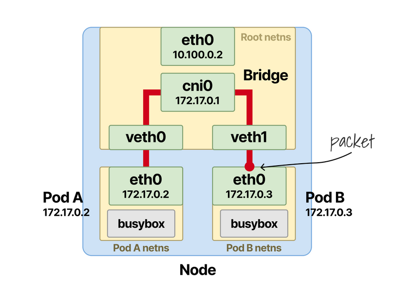 The packet reaches Pod-B veth in the root namespace, and from there, it quickly reaches the eth0 interface inside the Pod-B namespace.