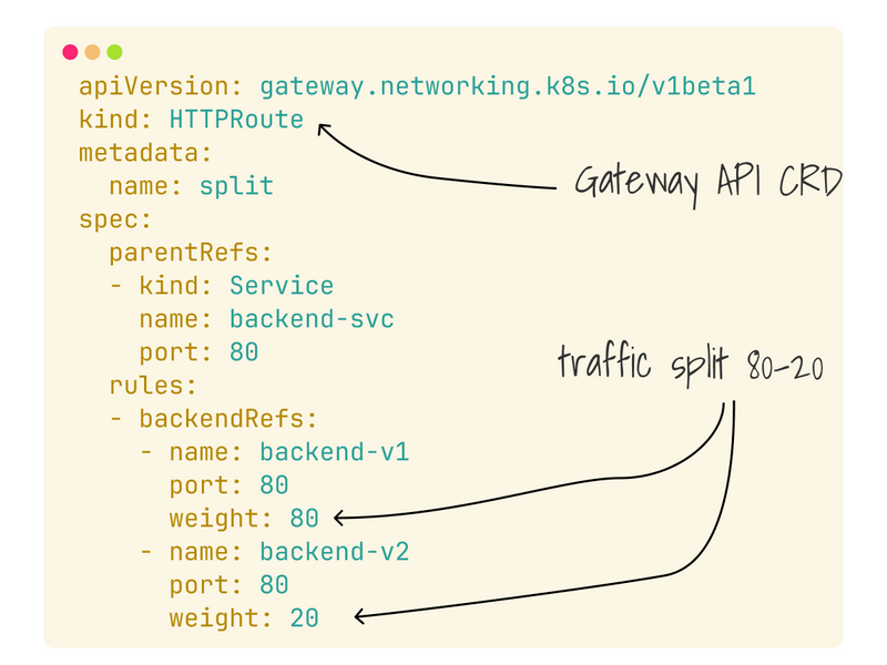 HTTPRoute is an object part of the Gateway API that lets you gradually increase and decrease the traffic and which you can use to transition from an 80-20 split to 0-100.