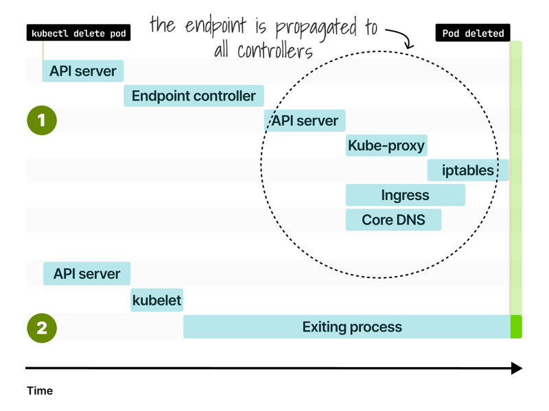 - Controllers (kube-proxy, ingress, etc.) to remove the endpoint.