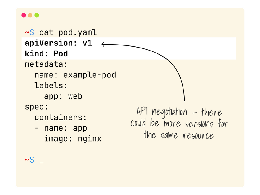 If your resource is a Pod, kubectl reads the apiVersion and kind fields and ensures those are available and supported in the cluster.