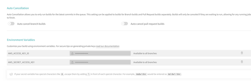Here we will add our AWS credentials as secrets, hit View Config, More Options and then Settings, in the Environment section add your credentials, be sure to check any spelling error, it should be the same as the env section in our .travis.ymlfile.