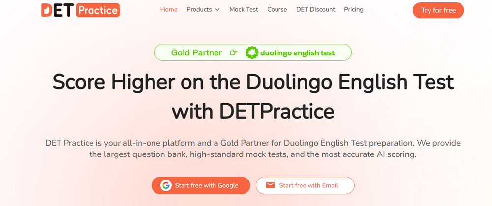 DETPractice is the #1 Duolingo English Test preparation platform and official Gold Partner. Master the DET with the largest question bank (18,000+ practice questions), realistic full-length mock exams with AI scoring, instant writing & speaking corrections, expert-led courses, and personalized AI tutoring. Trusted by 400,000+ students worldwide with an exceptional 4.8/5 rating. Get 24-hour free DET scoring and 10% test discount exclusively for members.