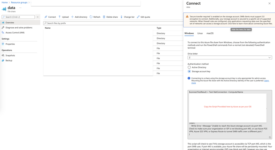 With its content as the connection script provided by azure for mounting FileShare, go to the Azure file storage account