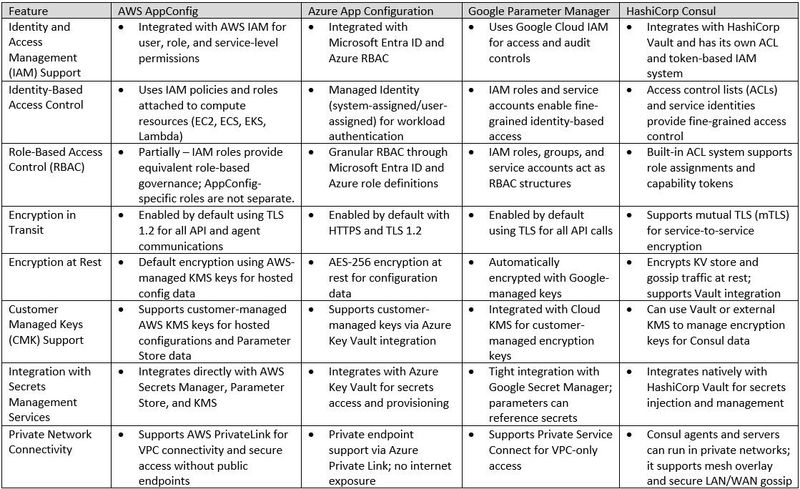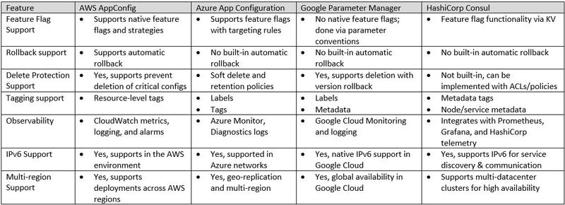 In this blog post, I have compared application configuration services (both vendor agnostic and non-vendor agnostic), in various aspects – from supported capabilities (such as versioning, service integration, feature flag support, to IAM, encryption, etc.)