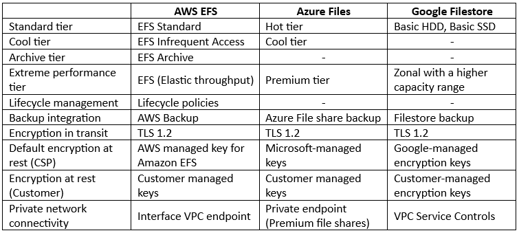 - AWS – Offers cheap storage tier called EFS One Zone file system, for scenarios where data access pattern is less frequent, and data availability and resiliency are not highly critical. By default, data inside the One Zone file system is automatically backed up using AWS Backup.