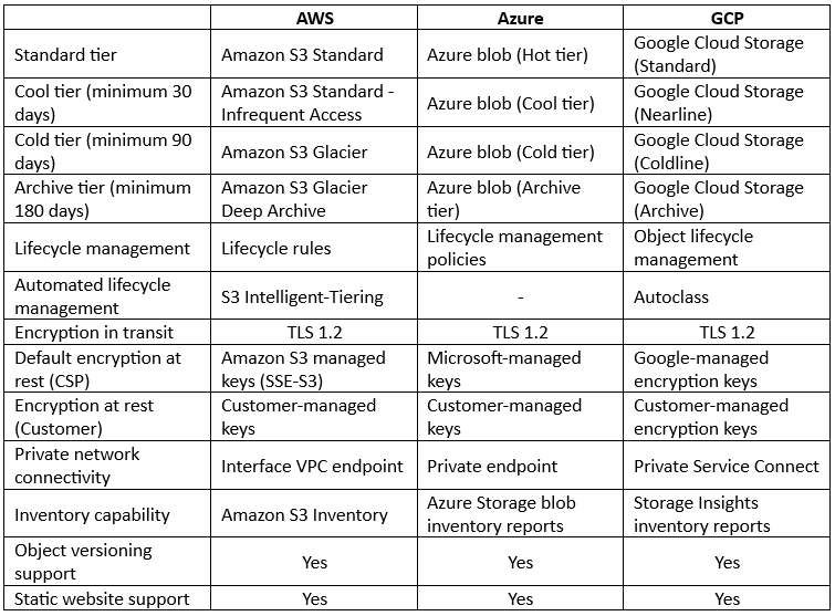 - AWS – Offers a cheap storage tier called S3 One Zone-IA for scenarios where data access patterns are less frequent, and data availability and resiliency are not highly critical, such as secondary backups. AWS also offers a tier called S3 Express One Zone for single-digit millisecond data access requirements, with low data availability or resiliency, such as AI/ML training, Amazon Athena analytics, and more.