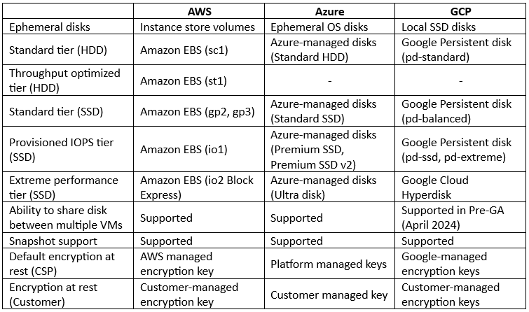 - GCP – Offers the ability to replicate persistent disks across two zones in the same region (Regional Persistent Disk). GCP also offers the ability to pre-purchase capacity, throughput, and IOPS to be provisioned as needed (Hyperdisk Storage Pools).