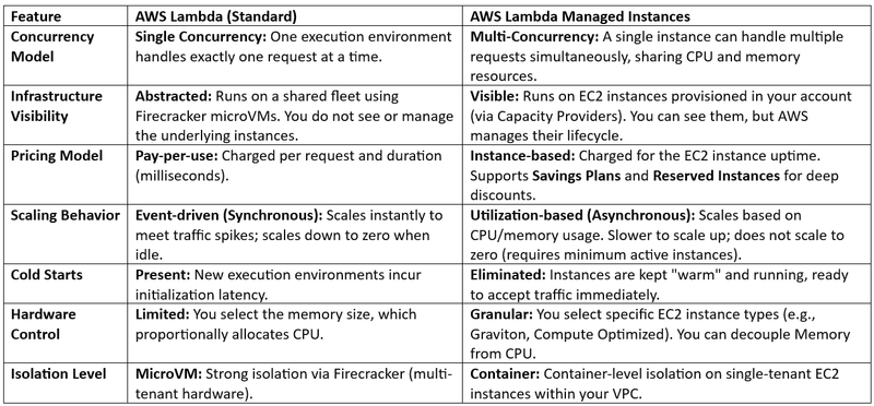 Below is a comparison between AWS Lambda and the AWS Lambda Managed Instances: