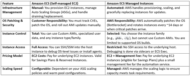 Below is a comparison between Amazon ECS (self-managed EC2) and the Amazon ECS Managed Instances: