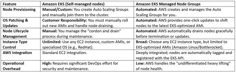 Below is a comparison between Amazon EKS (self-managed nodes) and the Amazon EKS Managed Node Groups:
