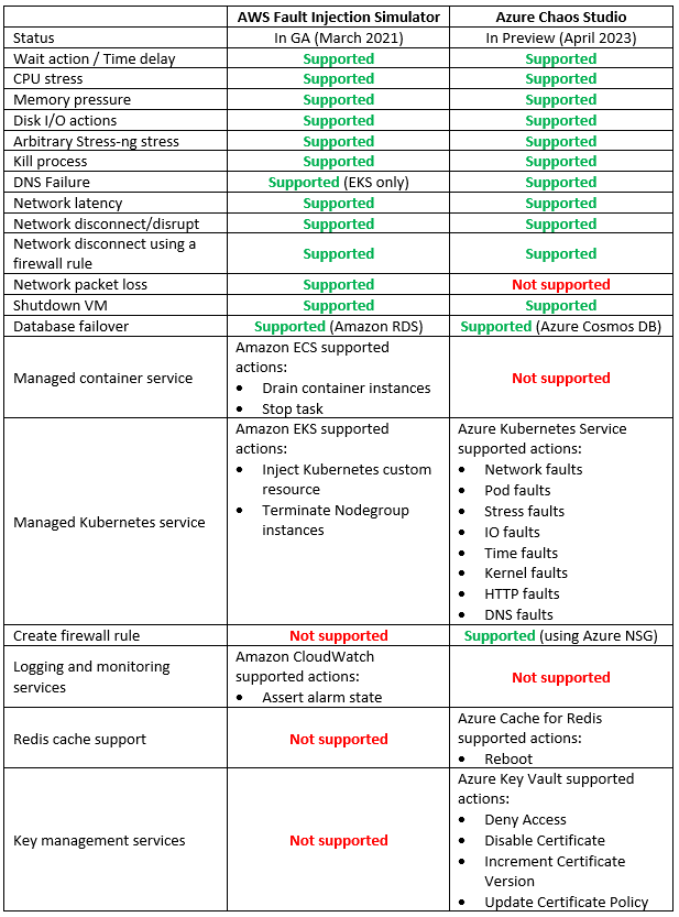 In the table below we can see a comparison between AWS and Azure-managed services for running Chaos Engineering experiments: