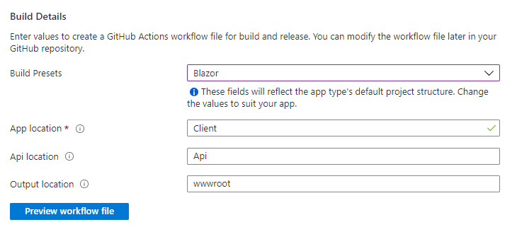 You now have three variables to fill in the location in your code of the Website, the location of your Azure Functions and the output location usually wwwroot. Once you have set these three you can preview the GitHub Actions file that will be created and added to your repository.